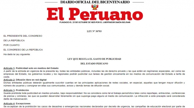 Norma legal que prohíbe publicidad estatal fue publicada para que entre en vigencia