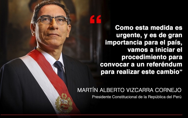 ERP. Ingresó al alto cargo por decisión de la mayoría fujimorista y de otras organizaciones políticas, habiéndosele señalado como un gobernante que prefería tener como base política a Fuerza Popular. El presidente Martín Vizcarra Cornejo, sorprendió en su mensaje a la Nación y trasladó decisiones importantes a la propia ciudadanía, quienes deberán pronunciarse vía referendo.