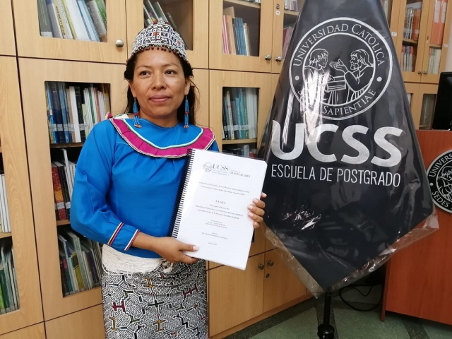 El título de su tesis es “Formación Profesional y Desarrollo De La Mujer Indígena En La UCSS–Nopoki, 2018", con el que ha obtenido la nota de ‘Cum Laude’, máxima calificación posible, y con el cual logra finalizar su maestría en Educación con mención en persona, familia y sociedad a la luz de la Doctrina Social de la Iglesia.