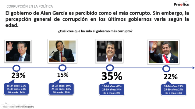De acuerdo al estudio realizado por Ipsos Apoyo en el mes de septiembre, un 35% considera que el gobierno de García Pérez fue mucho más corrupto, contra el 23% de Alberto Fujimori, el 22 de Ollanta Humala y el 15% de Alejandro Toledo. Además de ello, la encuesta considera que la población cree que la lucha contra la corrupción que realiza el actual presidente es ineficiente con el 75%.