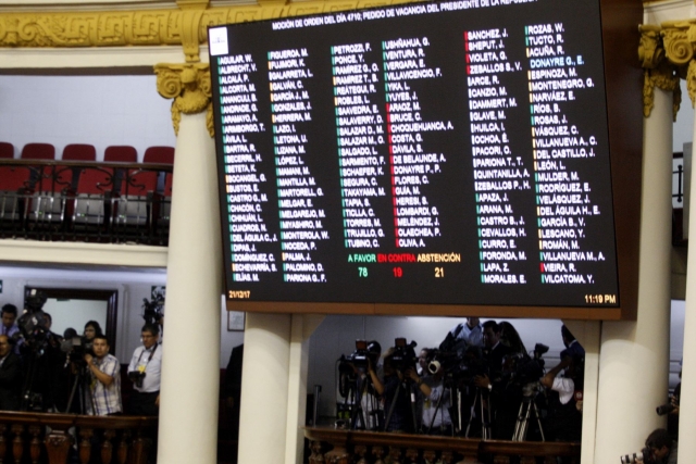 ERP. Del entusiasmo los fujimoristas pasaron a la decepción. Después de estar casi seguros respecto a la vacancia presidencial de Pedro Pablo Kuczynski, la mayoría del Congreso de la República se vio modificada por decisiones tras el debate y en la etapa de votación. Antes de entrar a la votación Kenji Fujimori, anunció mediante vídeo que se abstendría de la votación; lo que los demás no esperaron es que otros se vayan con él.