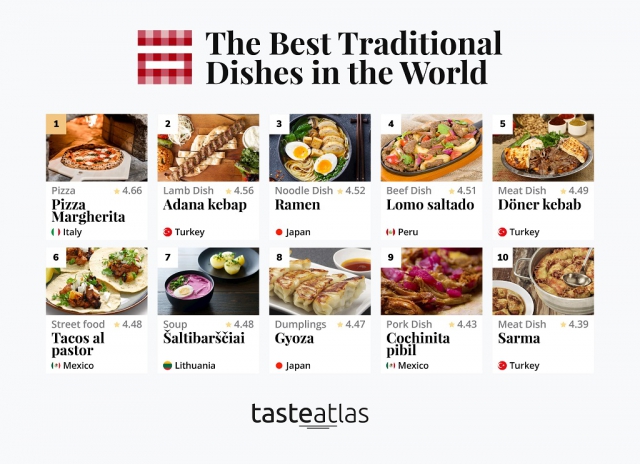 De acuerdo a la nómina, la pizza Margherita (Nápoles, Italia) ha sido votada como el mejor plato del mundo. El segundo mejor plato es el Kebab Turco Adana, seguido por el Ramen Japonés, el cuarto corresponde al lomo saltado de Perú, el doner Kebab de Turquía y así sucesivamente, en el puesto 18 se encuentra el popular ceviche, principal aperitivo de la comida peruana.