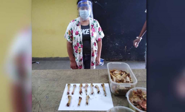 ERP. Personal de seguridad del Establecimiento Penitenciario de Piura intervino a la fémina Rosita Luz Tecco Rivas (28) identificada con DNI 47981139, cuando pretendía ingresar en un taper de comida huesos de patas de pollo con 7 bolsitas plásticas transparentes con una sustancia ilícita pastosa y parduzca aparentemente pasta básica de cocaína.