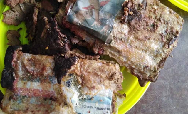 ERP. Agentes de seguridad del Establecimiento Penitenciario de Piura, hallaron dos paquetes rectangulares planos de papel periódico forrado precintada de 10 cm de largo x 6 cm de ancho aproximadamente, conteniendo sustancia granulada de color parduzca con olor y característica al parecer a pasta básica de cocaína, dentro de presas de hígado, durante la revisión de los paquetes.