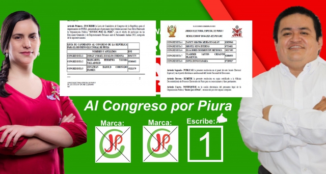 ERP. La lista congresal por el departamento de Piura de la organización política “Juntos por el Perú”, fue inscrita tras superar el proceso de tachas y no haberse presentado recurso alguno en contra de los candidatos. Esta lista que fue habilitada por el Jurado Nacional de Elecciones es liderada por el abogado Jorge Dávalos Córdova.