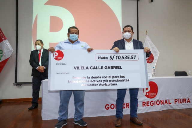 ERP. El gobernador regional de Piura, Servando García Correa entregó de manera simbólica cheques por casi 6 millones de soles por pago de deuda social a trabajadores y pensionistas de Agricultura, que más de 40 años, en algunos casos, han tenido que esperar para puedan acceder a sus derechos laborales.