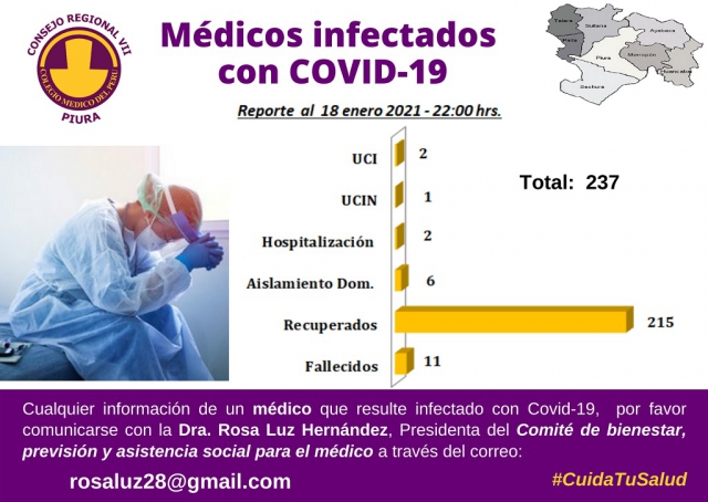 ERP. Como en los peores momentos de la pandemia, una vez más los profesionales médicos vienen siendo afectados por la Covid-19, según último reporte del colegio Médico de Piura. En lo que va del presente año, 11 médicos se encuentran contagiados, así lo indicó el Dr. Christian Requena Palacios, secretario de dicha organización, totalizando desde el primer caso un total de 237 infectados y en dicho número 11 fallecidos.