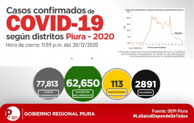 ERP. La tasa de letalidad por Covid-19 sigue incrementándose en la región Piura, de acuerdo al último informe que corresponde al 31 de diciembre del 2020, esta se ubicó en 3.72% lo que en términos sencillos significa que más personas están fallecido por esta terrible enfermedad. Los casos confirmados a la fecha son de 77,813 y los fallecidos 2,891 personas.