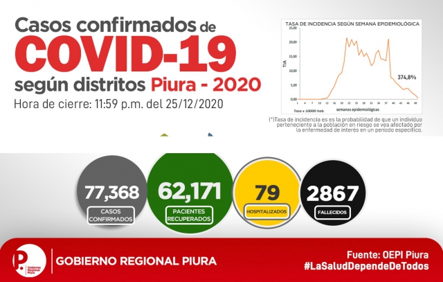 ERP. La Oficina de Epidemiología de la Dirección Regional de Salud de Piura, informó que al 26 de diciembre del 2020, se tiene 77,368 casos confirmados de Covid-19; en tanto que los fallecidos llegan a 2,867. La tasa de letalidad es elevada en relación a otros departamentos y se encuentra en 3.71%.