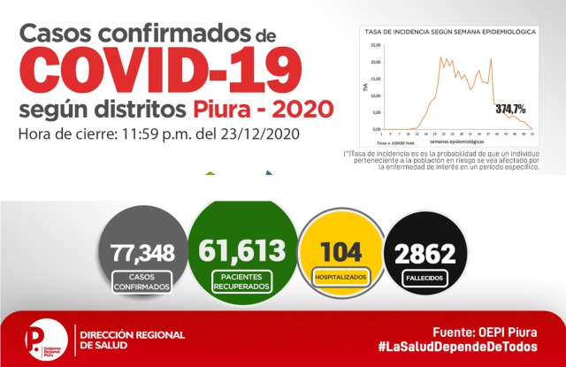ERP. La Covid-19 en la región Piura-sigue siendo una preocupación según los datos proporcionados por la Oficina de Epidemiología de la Dirección Regional de Salud al 24 de diciembre del 2020. El principal indicador y que son las muertes por la enfermedad subió de 3.,67% del día previo a 3.70% totalizando al momento 2,862 muertos, en tanto los casos positivos llegaron a los 77,348.