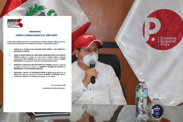ERP.. La Asamblea Nacional de Gobiernos Regionales del Perú presidida por el gobernador Servando García Correa, frente a los hechos de violencia tras la destitución del expresidente Martín Vizcarra, solicitó de manera inmediata la renuncia de Manuel Merino de Lama, quien asumió el cargo tras la polémica decisión de 105 congresistas de la República.