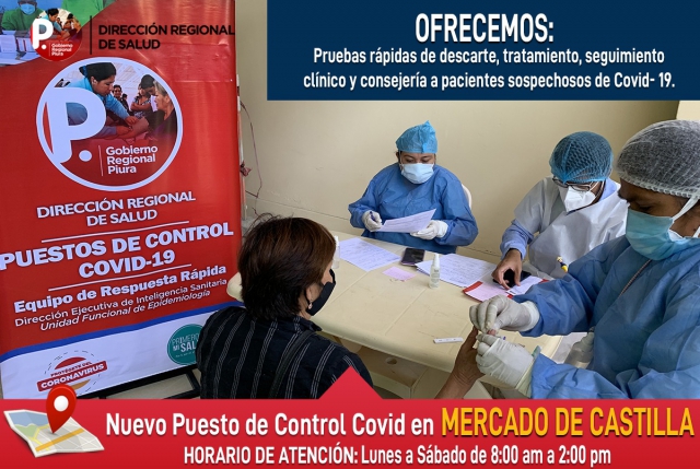 ERP. Con el fin de reforzar el primer nivel de respuesta frente a la COVID-19, el Gobierno Regional de Piura a través de Diresa, instaló un nuevo Puesto de Control Covid (PCC) en el principal centro de abastos del distrito de Castilla, provincia de Piura.