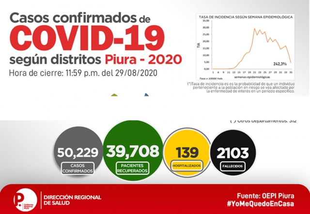ERP. La Oficina de Epidemiología de la Dirección Regional de Salud de Piura, informó la Sala Situacional por COVID-19 correspondiente al 30 de agosto 00 horas, la misma que no no se informó en el día previo cuando correspondía. De acuerdo a la misma se tienen 50,229 casos confirmados, en tanto que los fallecidos a dicha fecha por la enfermedad suman 2,103 personas.