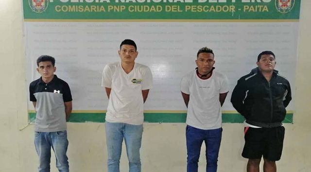 ERP. Jeison Enrique Puentes Fernández (26), Gregorio Medina Carrillo (26), Jesús Enrique Hernández Molano (26) y Ángel Oscar Castillo López (26) serán internado 09 meses preventivamente, en el penal de Piura, acusados por tres trabajadoras de asaltarlas con armas de fuego y robarles sus pertenencias (carteras, celulares, tarjetas de crédito, dinero en efectivo, documentos personales, entre otros).