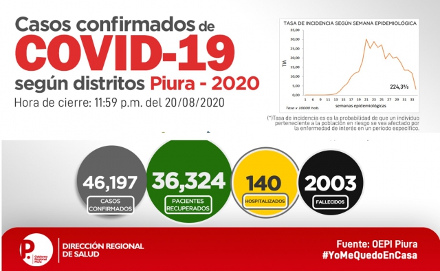 ERP. La Oficina de Epidemiología de la Dirección Regional de Salud de Piura, informó que al 21 de agosto del 2020, a las 00 horas, la cantidad de casos confirmados de COVID-19 suman 46,197; en tanto que los fallecidos registrados como consecuencia de la enfermedad totalizan 2,003.