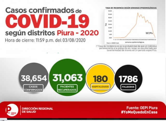 ERP. La Oficina de Epidemiología de la Dirección Regional de Salud de Piura, informó que al 4 de agosto, a las 00 horas, los casos confirmados de COVID-19 fueron 38,654; en tanto que los fallecidos por esta enfermedad suman 1,786. La tasa de letalidad llega al 4.6% en tanto que los pacientes recuperados son 31,064.