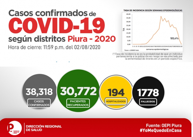 ERP. La Oficina de Epidemiología de la Dirección Regional de Salud de Piura, precisó que al 3 de agosto del 2020, hora de corte 00; los casos confirmados de Covid-19 totalizan 38,318; en tanto que los fallecidos suman 1,778. De acuerdo a los datos distritales, Piura tiene la mayor cantidad de contagiados con 5,083 afectados, en tanto que le siguen Castilla y Sullana.