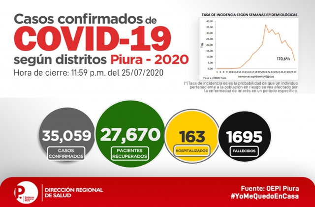 ERP. La Oficina de Epidemiología de la Dirección Regional de Piura, informó sobre la sala situacional del COVID-19 de la Región Piura correspondiente al 26 de julio, hora de cierre las 00 horas; indicando que a la fecha se tienen 35,059 casos confirmados, en tanto que los fallecidos por la enfermedad suman 1,695. Según el reporte el distrito de mayor incidencia es el de Piura.