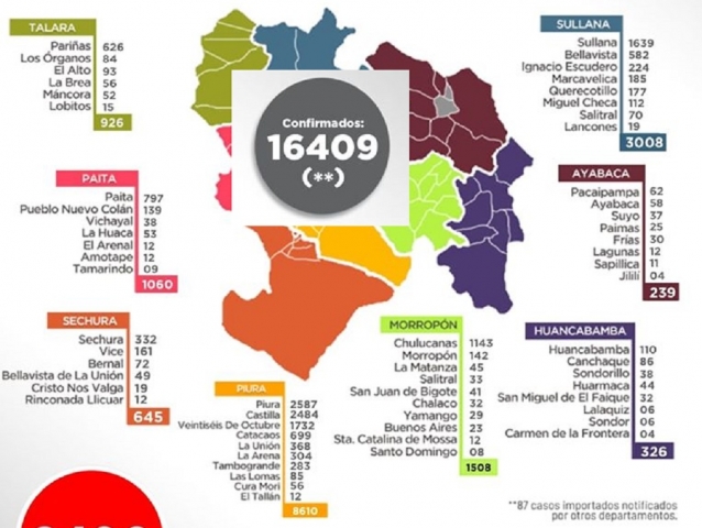 ERP. La región Piura, pese a la aparente normalidad sigue con niveles altos de casos COVID-19, totalizando al día anterior 16,409 confirmados, en tanto que lo más preocupante se encuentra en la alta cifra de fallecidos, los cuales llegan a 1,009. La información corresponde a la Oficina de Epidemiología de la Dirección Regional de Salud de Piura. La provincia de Piura es la que registra la mayor cantidad de casos.