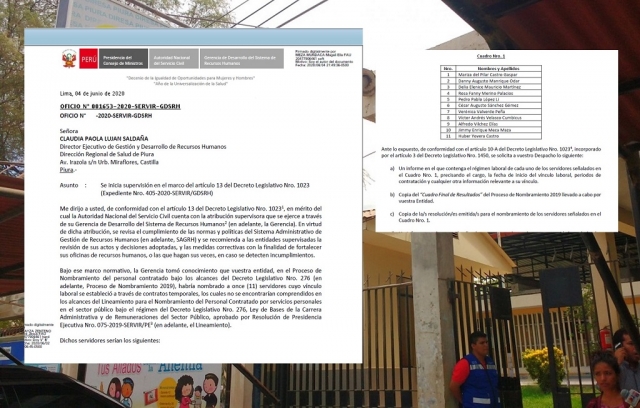ERP. Mediante Oficio la Autoridad Nacional Servir acorde a sus atribuciones, estará realizado una supervisión en el marco del artículo 13 del Decreto Legislativo Nro. 1023; por el presunto ilegal nombramiento de personal administrativo en la Dirección Regional de Salud de Piura, el cual a decir de los fundamentos de su acción no correspondería. La Directora Ejecutiva de Gestión y Desarrollo de Recursos Humanos deberá entregar la documentación respectiva.