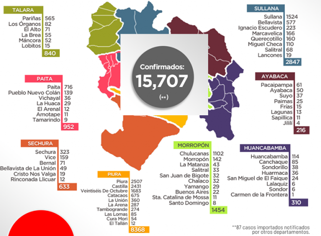 ERP. La Oficina de Epidemiología de la Dirección Regional de Salud de Piura, informó que a la fecha se tiene 15,707 casos confirmados de COVID-19, en tanto que las personas fallecidas llegan a las 982. En nuevo formato, se establece la cantidad que le corresponde a cada provincia, acorde a los distritos de cada una de ellas, correspondiendo a Piura, la mayor cantidad con 8,368 contagiados.