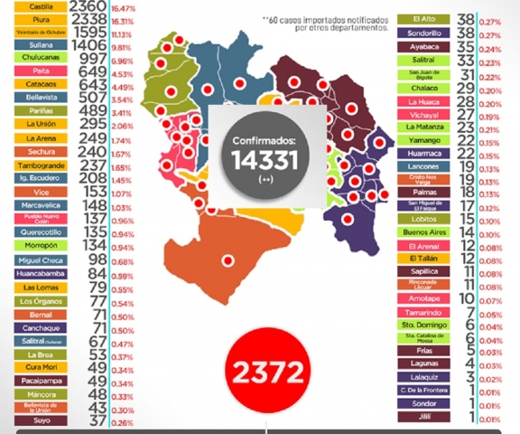 ERP. La Oficina de Epidemiología de la Dirección Regional de Salud de Piura, registró 14,331 casos confirmados de COVID-19; siendo el distrito de Castilla el de más alto índice de contagiados; en tanto los fallecidos por dicha enfermedad son 931 personas en la sumatoria regional. .