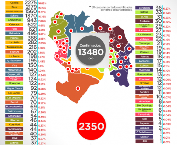 ERP. La Oficina de Epidemiología de la Dirección Regional de Salud de Piura, informa que se tiene 13,480 casos confirmados de COVID-19, en tanto que las personas fallecidas por la enfermedad son 889. De acuerdo a la misma fuente, el mayor lugar de incidencia es el distrito de Castilla con 2,275 positivos, seguido de Piura con 2,179; Veintiséis de Octubre con 1569 y distrito de Sullana con 1,370.