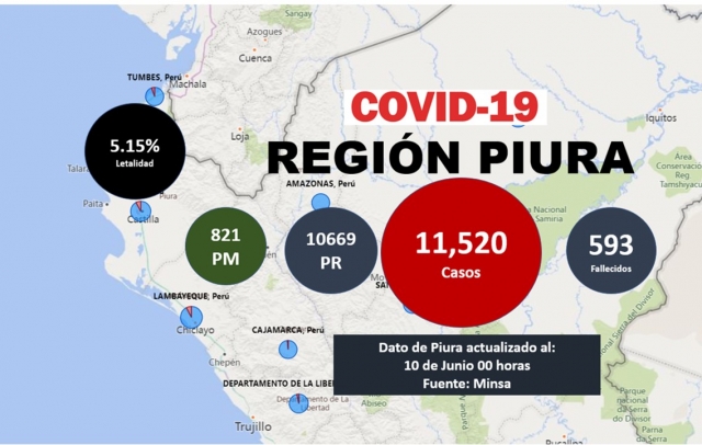 ERP. El Instituto Nacional de Salud y Centro Nacional de Epidemiología, Prevención y Control de Enfermedades del Ministerio de Salud. en su reporte de la situación del COVID-19 en la región Piura, informa que se han registrado 11,520 casos confirmados y los fallecidos llegan a los 593 al 10 de junio del presente con una letalidad de 5.15%. La cifra es totalmente inferior a los difundidos por la Oficina de Epidemiología de la Diresa.