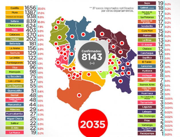 ERP. La Oficina de Epidemiología de la Dirección Regional de Salud, la misma que lleva el control de casos de Covid-19, publicó sus resultados dos días después del anterior y reapareció este lunes en horas de la noche para dar a conocer que en la Región Piura se tienen 8,143 casos confirmados similar al dato proporcionado por el Ministerio de Salud; respecto a las defunciones la OEPI precisa que son 549 personas las fallecidas hasta el momento. .