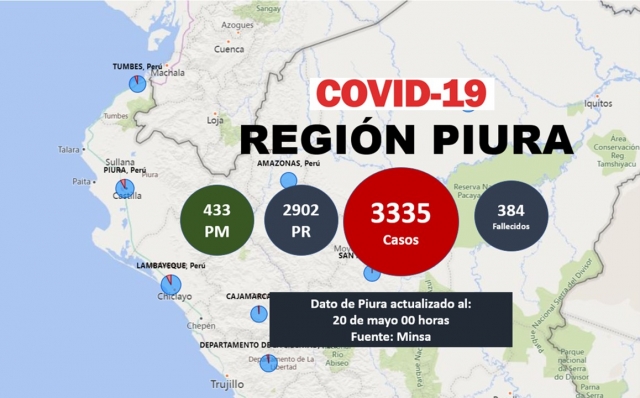 ERP. Al 20 de mayo del 2020, el Instituto de Salud y Centro Nacional de Epidemiología, Prevención y Control de Enfermedades del Ministerio de Salud, informó que la región Piura tiene a la fecha 3,335 casos confirmados de Covid-19 y registra 384 fallecidos una cifra que repite las debilidades conocidas cuando se trata de saber la cantidad exacta de fallecidos. Según el dato nacional la tasa de letalidad de 11.51% sigue siendo la más alta del país.