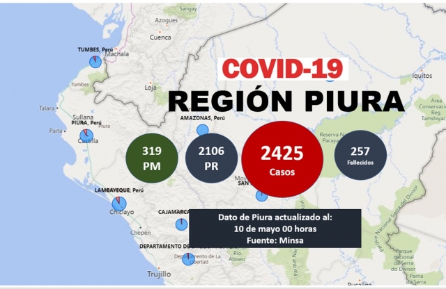 ERP. Al 10 de mayo del 2020, el Instituto de Salud y Centro Nacional de Epidemiología, Prevención y Control de Enfermedades del Ministerio de Salud, informó que la región Piura tiene a la fecha 2,425 casos confirmados de Covid-19 y registra 257 fallecidos, con una tasa de letalidad del 10.60% la más alta del país. Como hemos manifestado diariamente se difunden los datos de las salas situacionales, la nacional y la regional que se encuentra a cargo de Diresa.
