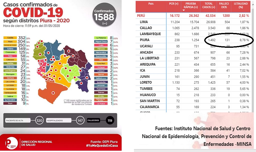 ERP. La región Piura sigue subiendo en casos en clara demostración que la estrategia para la contención ha sido debil y se demuestra con los datos proporcionados por el Instituto de Salud y Centro Nacional de Epidemiología, Prevención y Control de Enfermedades del Ministerio de Salud. Al 5 de mayo y a las 00 horas, se tiene 1,804 casos positivos de Covid-19 y los fallecidos ascienden a 149 personas.
