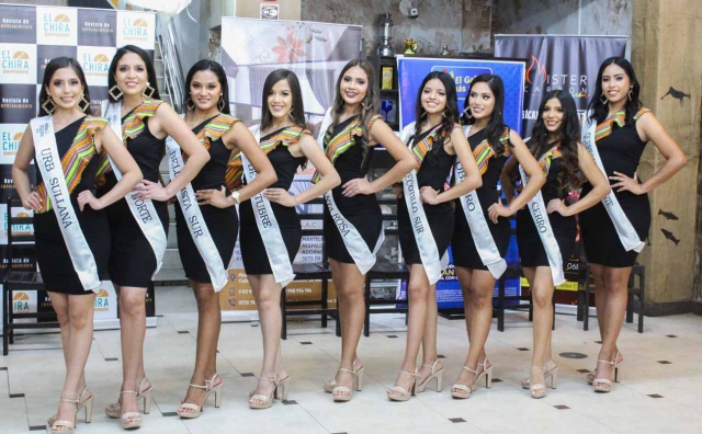 Greysi Vásquez (El Obrero), Alexandra Aguirre (Bellavista), Anny Ruiz (9 de Octubre), Karly Becerra (Santa Rosa), Laura Jáuregui (Querecotillo), María Luzardo (Sánchez Cerro), Nadia Encalada (Urb. Sullana), Romina Castillo (Bellavista) y Ruth Sabalú (Querecotillo) son las 9 candidatas que fueron presentadas ante los medios de comunicación.