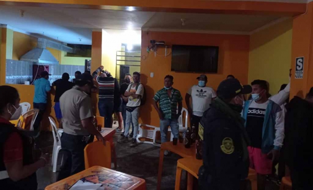 ERP. Nuevamente fueron intervenidos decenas de parroquianos junto con jovencitas, algunas de procedencia extranjera, al interior de varios locales que funcionan sin respetar los protocolos sanitarios. Se trata de un bar ubicado en la calle Vichayal del asentamiento 9 de Octubre, donde el personal de Fiscalización municipal encontró a 23 hombres y 13 mujeres consumiendo bebidas alcohólicas. El local incumplió el aforo, protocolos y el horario de cierre por el toque de queda.