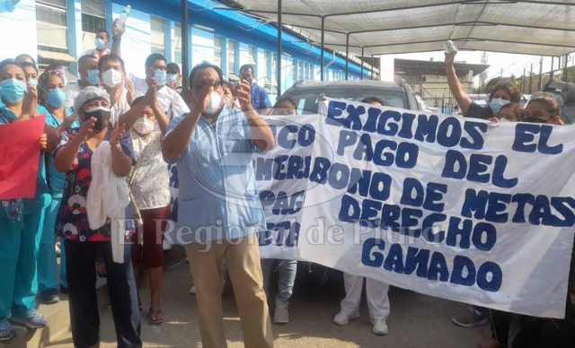 ERP. El personal de salud perteneciente al Hospital de apoyo II de Sullana, realizó un plantón en los exteriores de dicha entidad, exigiendo el pago del bono por cumplimiento de metas. Indicaron venir realizando las gestiones en el Gobierno Regional de Piura; sin embargo, no son atendidos, pese al ofrecimiento recibido por parte de uno de los funcionarios de presupuesto.