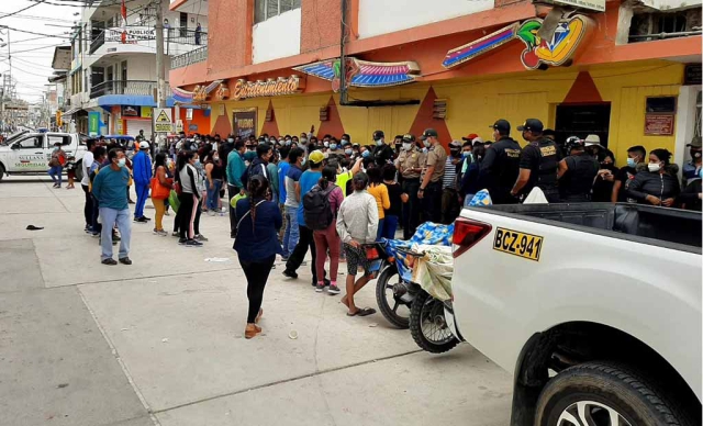 ERP. Con la finalidad de prevenir los contagios por el coronavirus, la Municipalidad Provincial de Sullana conjuntamente con la Policía Nacional realizaron un operativo de ordenamiento en los exteriores del Banco de la Nación.
