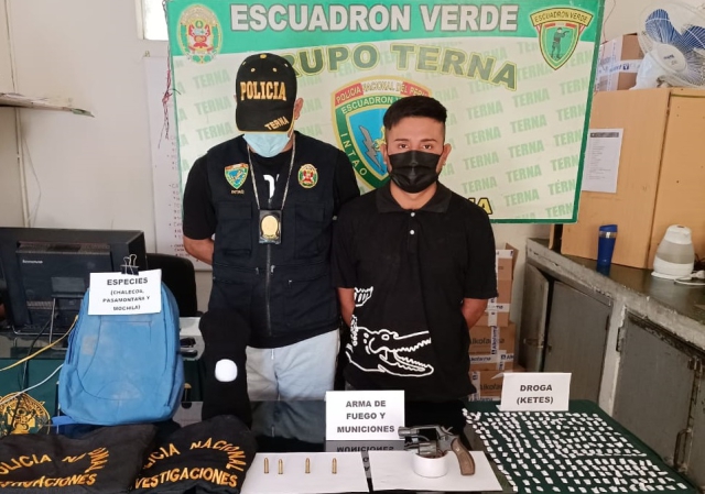 ERP. Un sujeto que caminaba en actitud sospechosa sin polo, con una mochila azul y en el cinto una pistola, por las calles del asentamiento humano Sagrado Corazón de Jesús en Tambogrande, provincia de Piura, sin saber que sus movimientos eran observados por efectivos del grupo Terna quienes lo capturaron.