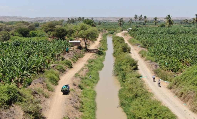 El canal Miguel Checa es el más antiguo e importante infraestructura de riego del Valle del Chira. Tiene una longitud de 78.5 kilómetros. Sus aguas discurren directamente sobre tierra y gran parte se filtra durante el recorrido. Se estima que las pérdidas de agua alcanzan los 350 millones de metros cúbicos al año.