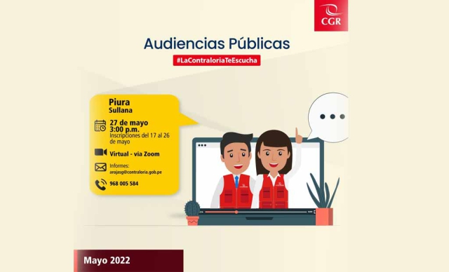 ERP. Con el objetivo de recibir alertas y denuncias sobre el uso inadecuado de bienes y recursos públicos, la Contraloría General de la República convoca a ciudadanos y representantes de la sociedad civil de la provincia de Sullana a participar en la audiencia pública virtual “La Contraloría te escucha”, que se realizará el viernes 27 de mayo.