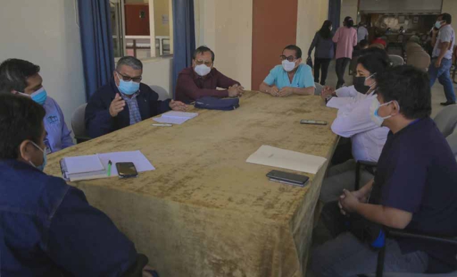 El regidor Luis Almestar Juárez, en representación del alcalde Power Saldaña Sánchez, lideró la mesa de trabajo a la que fueron convocados el director del Hospital de Apoyo II, Dr. Miguel Córdova, la empresa a cargo de la obra de ampliación, Enosa, así como representantes del Hospital SISOL.