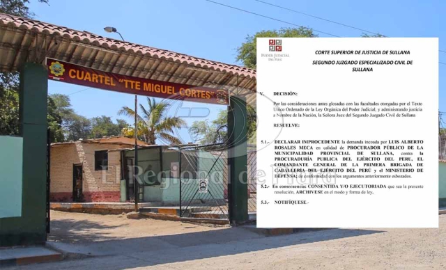 ERP. La Municipalidad Provincial de Sullana, promovió una Acción de Cumplimiento en la Corte Superior de Justicia de esta localidad, para que el Ministerio de Defensa y la Primera Brigada de Caballería les entregue el inmueble del cuartel Teniente Miguel Cortés, sin embargo, tras la evaluación prolija que se hizo del caso, se declaró improcedente dicha demanda, pues no han ejecutado nada de las condiciones que dispone la transferencia.