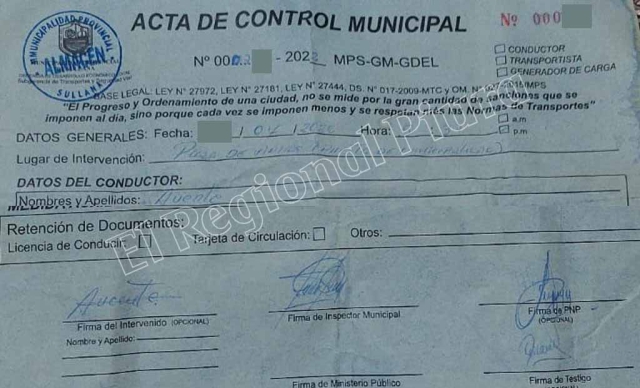 Hace la denuncia a través de este medio, considerando que la denominada Acta de Control Municipal, tiene una serie correlativa, lleva sellos de la Municipalidad, firmas de un inspector municipal e incluso de un representante de la Policía Nacional del Perú. Además, es poco común que, tras la imposición de un documento, se esté llamando con insistencia para lograr un arreglo. Se pide investigación.