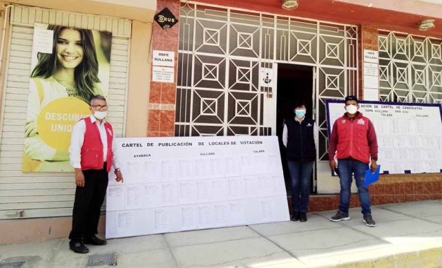 Los carteles con la lista de locales de votación fueron publicados en el exterior de la oficina principal de la ODPE, ubicada en calle San Martín N°1045, distrito de Sullana, y en las instituciones educativas que servirán como locales de votación en cada uno de los 24 distritos y 13 centros poblados, la lista también fue pegada en el frontis de instituciones públicas y lugares más frecuentados por la población de Sullana.
