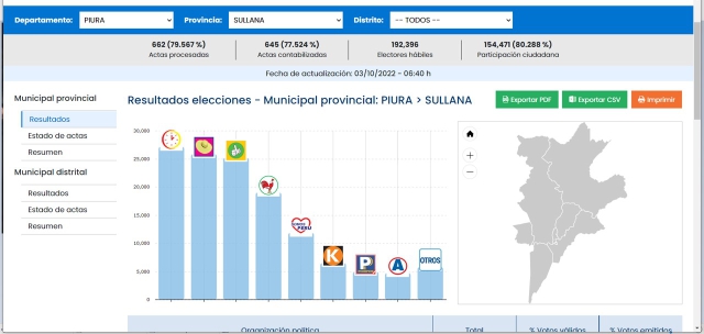 ERP. Tanto como sucede en Lima, en la provincia de Sullana, el ganador de las elecciones municipales se definirá cuando se computen el 100% de los votos, considerando que de acuerdo a la Oficina Nacional de Procesos Electorales, existen porcentajes cercanos entre Hildebrando Crisanto Vilela con Marlem Mogollón Meca. Al 74.880% de las actas contabilizadas el candidato de Contigo Región tiene el 20.718 % de los votos válidos, seguido de Región para Todos con el 19.508 %.
