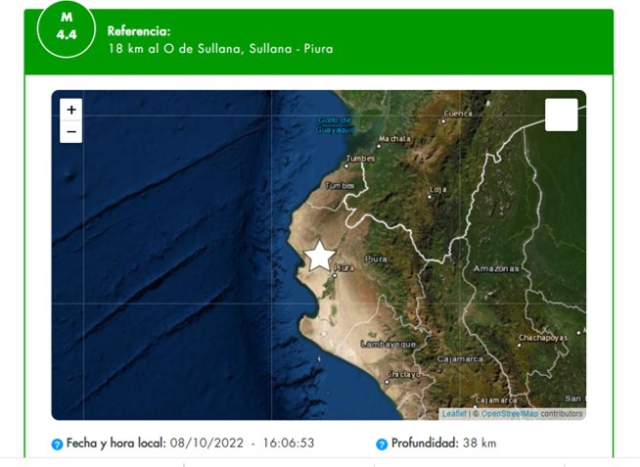 ERP. Un nuevo sismo, en esta oportunidad de magnitud 4.4 fue percibido en la provincia de Sullana. De acuerdo a la información proporcionada por el Instituto Geofísico del Perú, el evento se produjo a las 4 de la tarde con 06 minutos y 53 segundos, localizándose a una profundidad de 38 kilómetros y a 18 Km al Oeste.