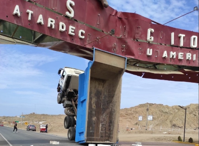 El conductor del vehículo pesado no calculó la altura del pórtico y el volquete que llevaba la tolva levantada quedando ésta empotrada en la obra de infraestructura en la que gastó S/ 419,000 y que ya habría sido objetada por Contraloría General.