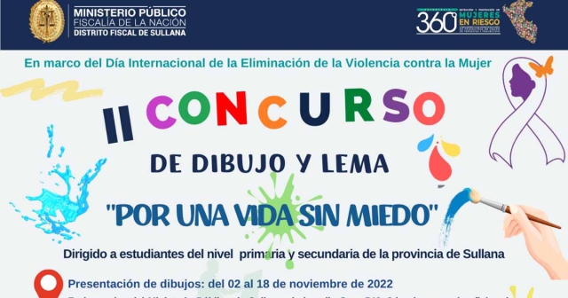 ERP. Los integrantes de la Mesa Intersectorial de la Estrategia 360° del Ministerio Público del Distrito Fiscal de Sullana organizan el segundo concurso de Dibujo y Lema denominado: “Por una vida sin miedo”, dirigido a los estudiantes de primaria y secundaria de las instituciones públicas y privadas de la provincia de Sullana.