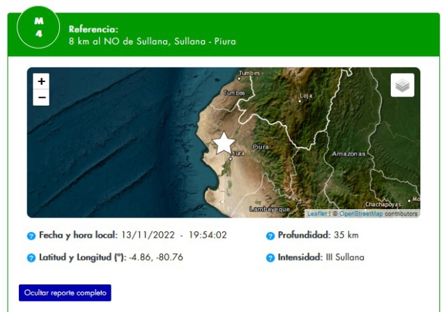 ERP. La tierra sigue temblando en la provincia de Sullana. Este domingo 13 de noviembre, a las 19 horas con 54 minutos y 2 décimas, se sintió un temblor de una magnitud de 4.0, el mismo que fue localizado a 8 kilómetros al noroeste y a una profundidad de 35. De acuerdo a la información del Instituto Geofísico del Perú, la intensidad fue de III Sullana.