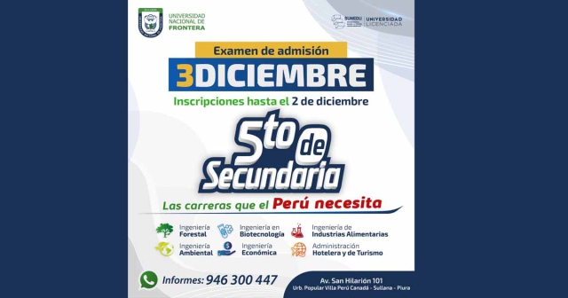 ERP. La Universidad Nacional de Frontera (UNF), ubicada en la provincia de Sullana, realizará una evaluación especial dirigida a los escolares que actualmente cursan el quinto grado de secundaria.