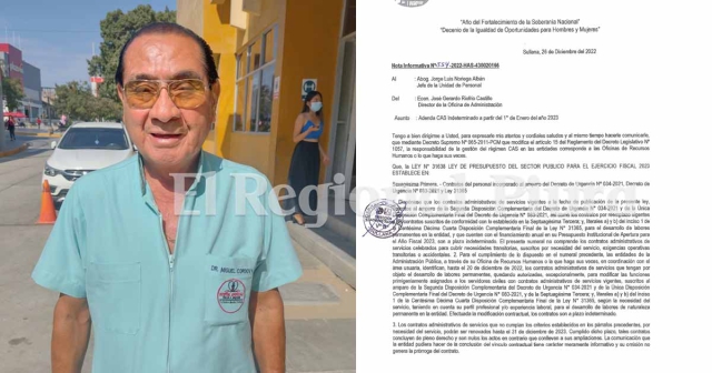 ERP/C.Chávez. Mediante nota informativa Nº 554- 2022- HAS-430020166 el director de la oficina de Administración, Econ. José Gerardo Riofrío Castillo informa al abogado Jorge Luis Noriega Albán, jefe de la unidad de personal dar adenda indeterminada apartir del 1 de enero del 2023, a varios trabajadores, entre ellos a la hija del director, Miguel Córdova.